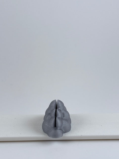 This photo card holder is a small, heart-shaped object, 3D printed. The heart itself is solid and has a small groove at the top, to hold a photo or card. It stands on a circular, tiered base that adds to its stability and aesthetic. The overall design is simple and modern, with a romantic touch.